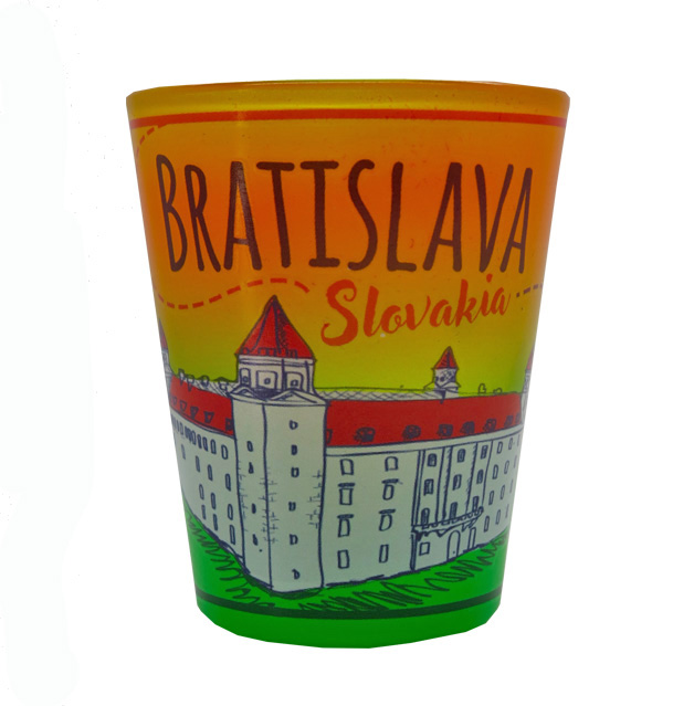 Panák (štamprle) Bratislavský hrad a nápis Bratislava 0,04 l - farebný